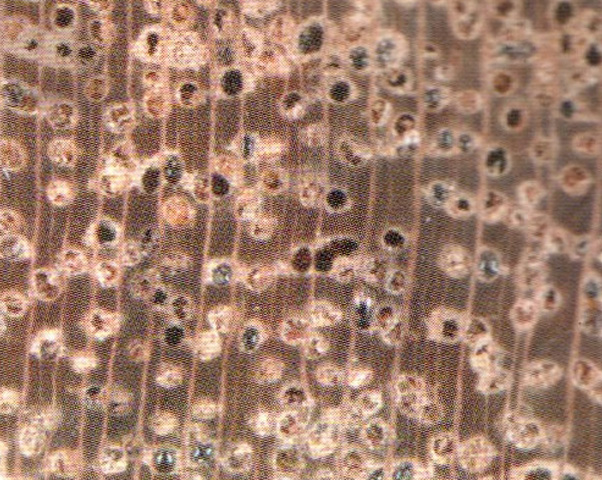 散孔材。管孔肉眼下可(kě)見,略少,大小(xiǎo)中(zhōng)等;主為(wèi)單管孔,極少短徑列複管孔(2~3個);部分(fēn)略斜列;多(duō)褐色樹膠。軸向薄壁組織放大鏡下可(kě)見,環管束狀、近翼狀及聚翼狀。木(mù)射線(xiàn)放大鏡下明顯,略密,略寬。軸向樹膠道肉眼下明顯,白色點狀,單獨或短弦列。