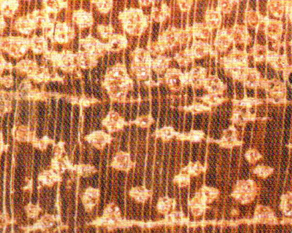 散孔材。管孔肉眼下可(kě)見,少,略大;主為(wèi)單管孔,少數徑列單管孔(2~4個);侵填體(tǐ)豐富。軸向薄壁組織肉眼下可(kě)見,短翼狀、聚翼狀、環管束狀及不規則弦向帶狀。木(mù)射線(xiàn)放大鏡下明顯,密度中(zhōng),窄。
